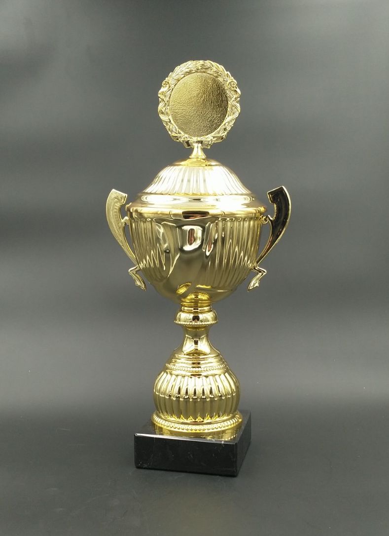 Kuldne kaanega karikas marmoralusel.
